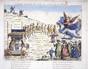 This elaborate print, which emphasizes the dash of the aeronauts more than the flight, was published on June 25, 1785, to commemorate a planned flight on June 29. We see that the balloon was to be readied for three people. A memoir written by "Mrs. Sage," the woman depicted in the print, records that five people crowded into the basket when the balloon was inflated; their weight proved too much for the available lift. Three, including Lunardi, left the gondola, and Mrs. Sage and the 25-year-old George Biggin ascended, making Sage "the first English female aerial traveller." Sage mused that Mr. Biggin thought it "no degradation to communicate his observations to a woman, of whose understanding, I am proud to think, he had not a contemptible opinion." While aloft, Biggin made various scientific observations, holding an electrometer with two pith balls at arm's length and "exposing it to a cloud we were then passing . . . he told me his conclusion, which was that the electricity of that cloud was negative.”