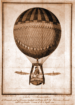 In the last state, the artist has added a hat and improved the collar and tie of the figure on the left, which is no doubt George Biggin. This change might have resulted from the wealthy Biggin's objection that without these accessories he would appear as the social inferior of Lunardi, although in fact Biggin had provided substantial monetary support to the balloonist. Gibbs-Smith describes Lunardi's dress as "the uniform of the Honourable Artillery Company." The cannon-like device below the basket may be intended to represent and publicize Lunardi's poorly documented experiments with cannons. What seems to be the original drawing for this print is shown in Alvin Josephy, Adventure of Man's Flight, p. 52. This plate reportedly existed and was being used in the twentieth century. The engraver, Francesco Bartolozzi [whose life dates have also been given as 1748—1815], engraved Lunardi's portrait in 1784 [Gimbel XC-10-2A 3261].)